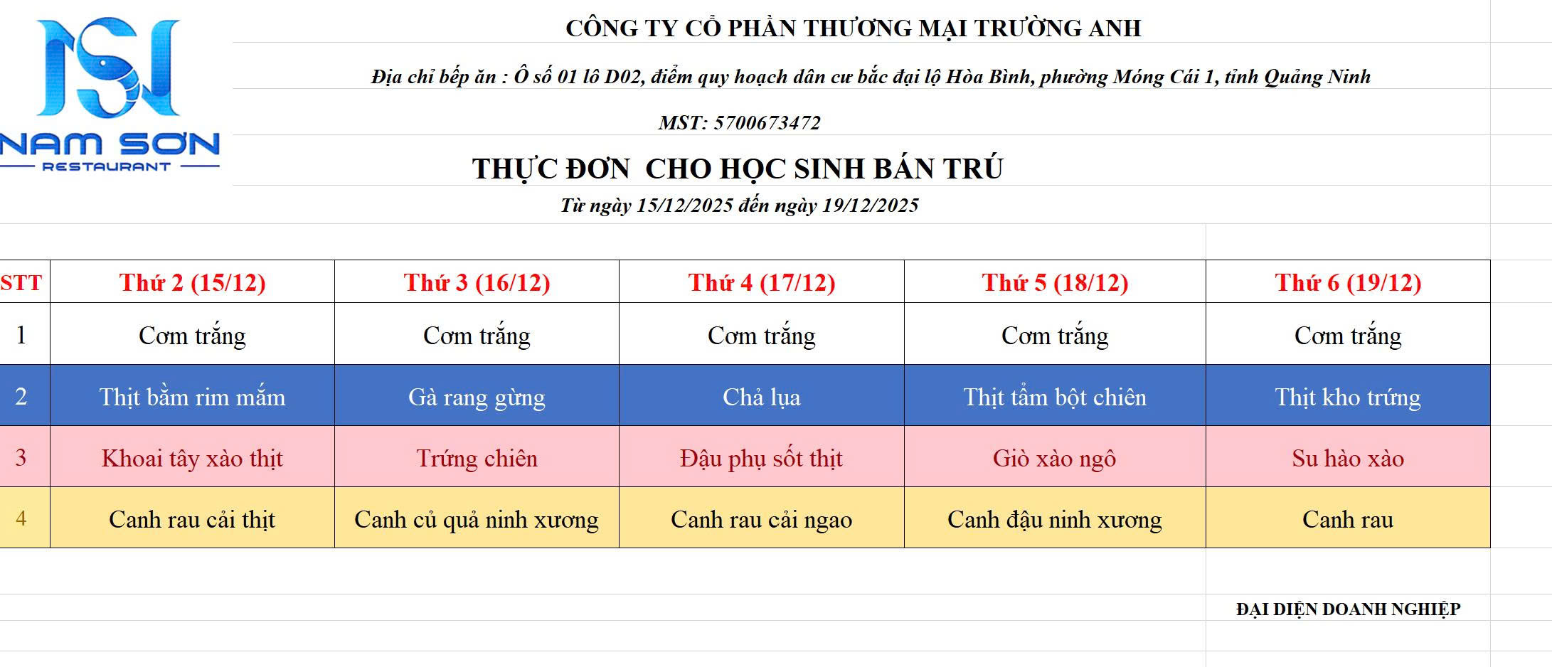 Thực đơn tuần 15 (15/12-19/12/2025)