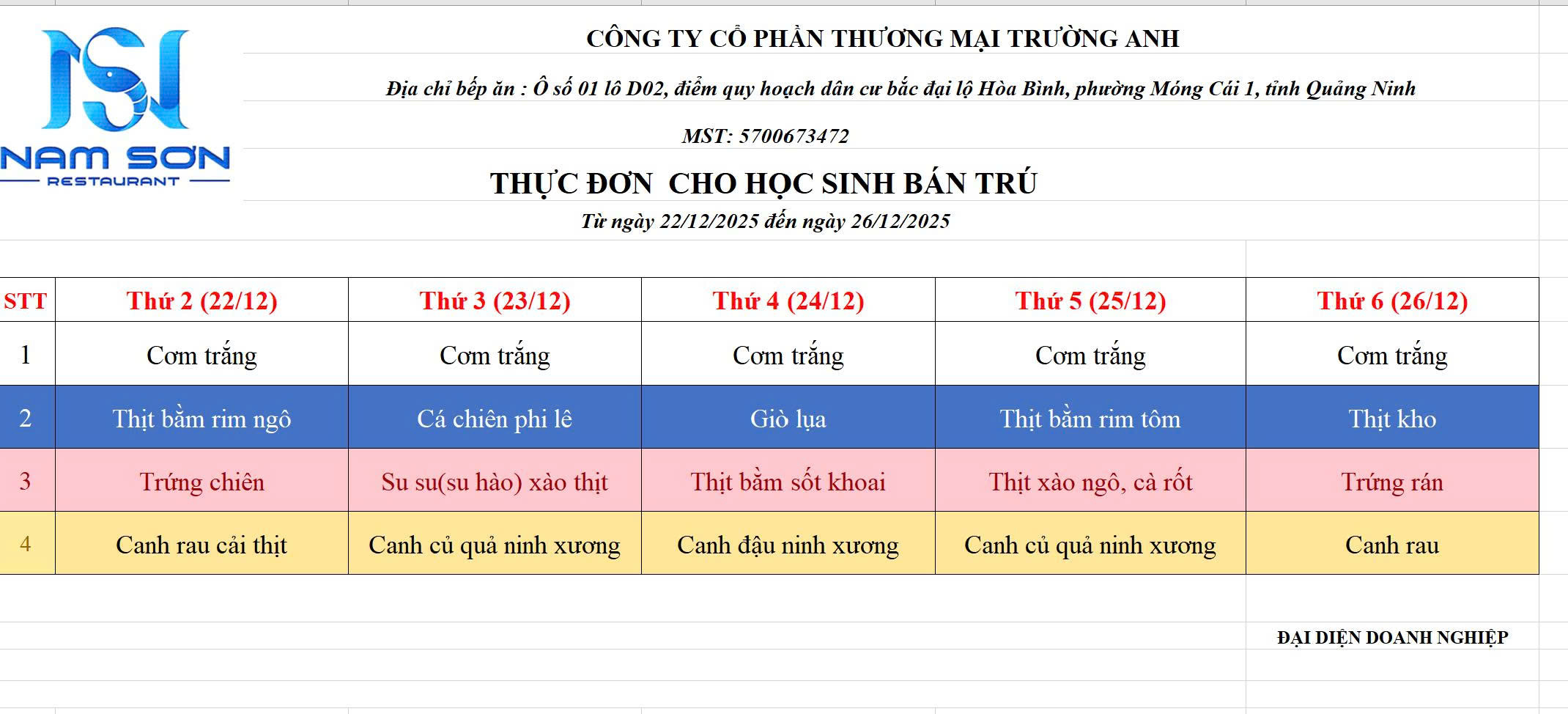 Thực đơn tuần 16 (22/12-26/12/2025)