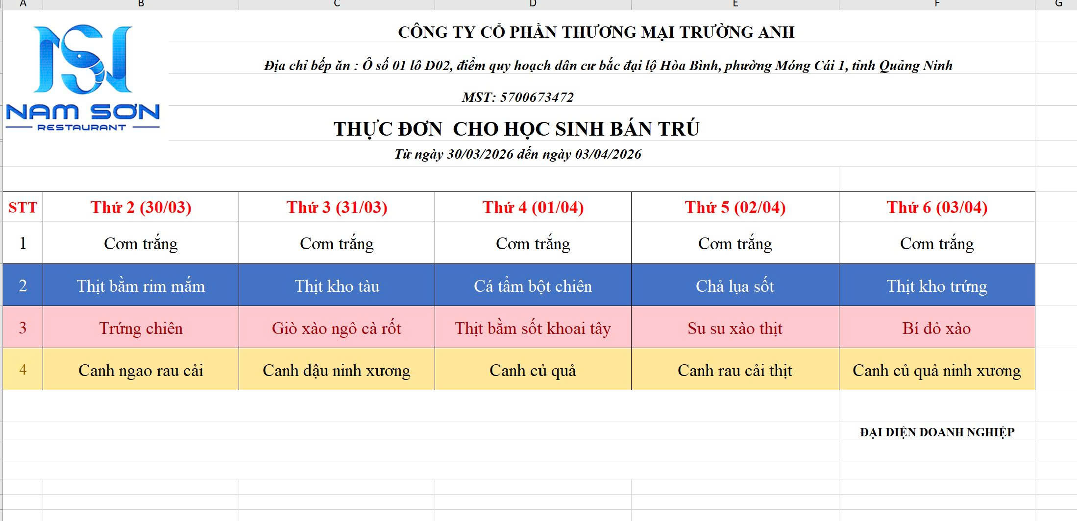 Thực đơn tuần 28 (từ 30/03 đến 03/04/2026)